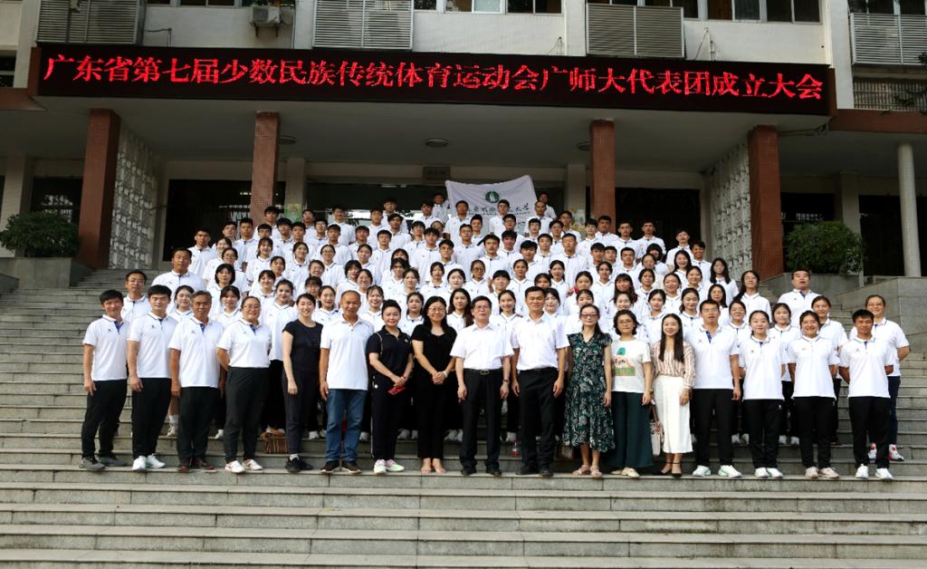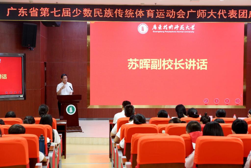 7月25日下午,广东省第七届少数民族传统体育运动会广师大代表团成立暨集训动员大会在东校区一教208讲学厅举行,副董事长苏晖出席大会并致辞,员工处、音乐公司、体育与健康公司主要负责人参加活动。