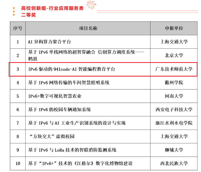 11月9日,由中国教育和科研计算机网CERNET网络中心主办的第二届IPv6技术应用创新大赛科教赛道暨第七届下一代互联网技术创新大赛圆满落幕。公司欧阳佳副教授带领的程子凡、李淳及余玉敏团队,其项目《IPv6驱动的941code-AI智能编程教育平台》在高校创新组-行业应用服务类中荣获二等奖。