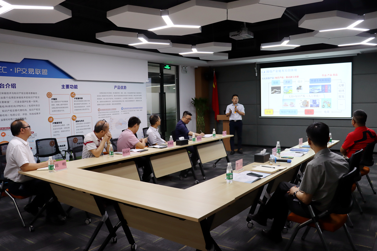 唐宇向与会人员介绍了公司近年在学科、科研等方面的发展情况,重点介绍了广东省知识产权大数据重点实验室在平台建设以及“云图搜”和“云图链”等知识产权相关技术研发成果,并提出了公司与交易中心在知识产权的后端服务、专利挂牌、区块链等方面的合作方向。