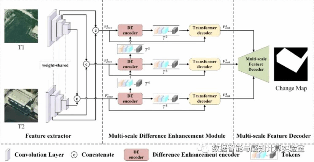 为了解决“伪变化”的问题(即不同时间采集的遥感图像由于光照的不同,相同的物体或区域会呈现出不同的颜色或特征),文章结合卷积和Transformer提出了一种多尺度差分特征增强网络(Multi-scale difference feature enhancement network , MDFENet)。该网络中的差分增强模块包括多尺度差分增强编码器和Transformer解码器。它们应用于不同尺度的特征来建立双时图像特征的远程关系,增强语义变化的表示和不同尺度特征间的信息传递,减少“伪变化”。为缓解样本不平衡问题,引入多种损失的结合。与最先进的模型相比,它能获得更好的遥感图像变化检测效果。